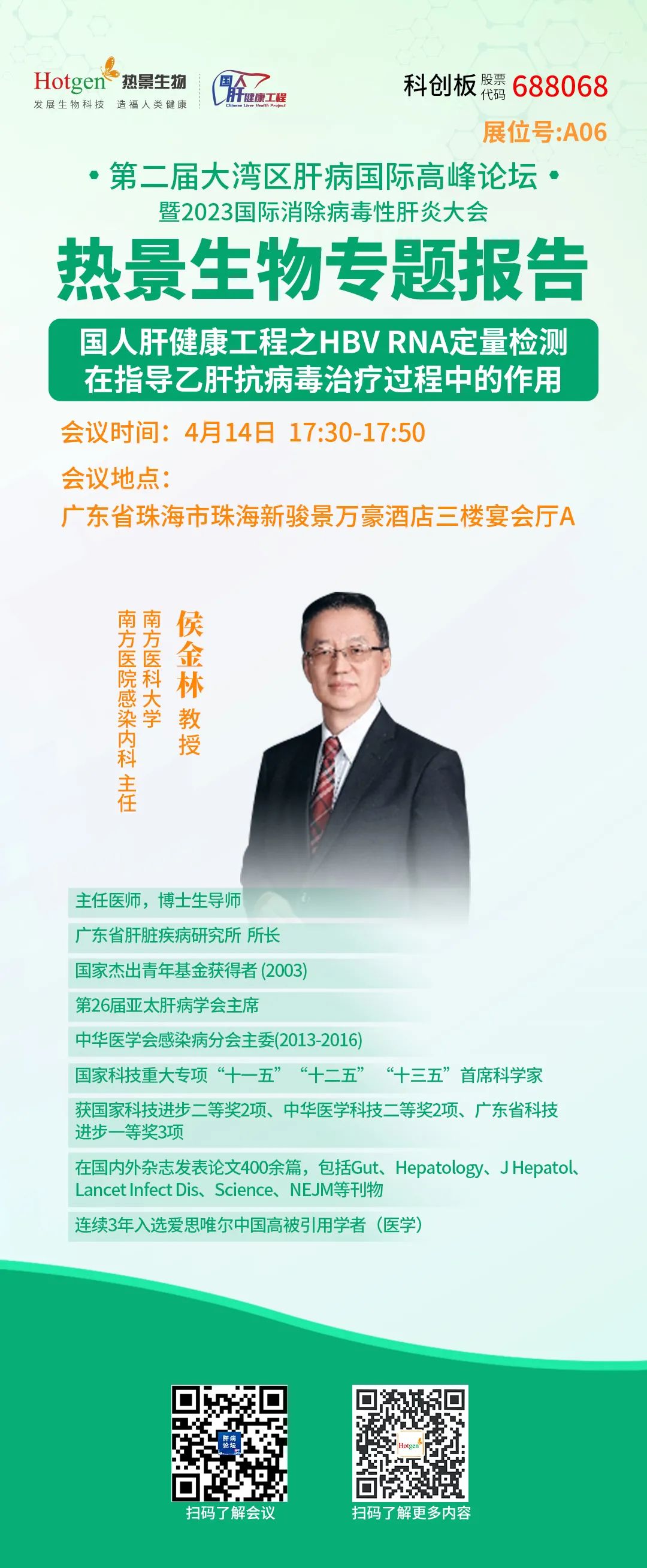 4月14日下午17:30-17:50,南方醫(yī)科大學南方醫(yī)院感染內(nèi)科主任侯金林教授受邀進行熱景生物專題研討會《國人肝健康工程之HBV RNA定量檢測在指導乙肝抗病毒治療過程中的作用》。