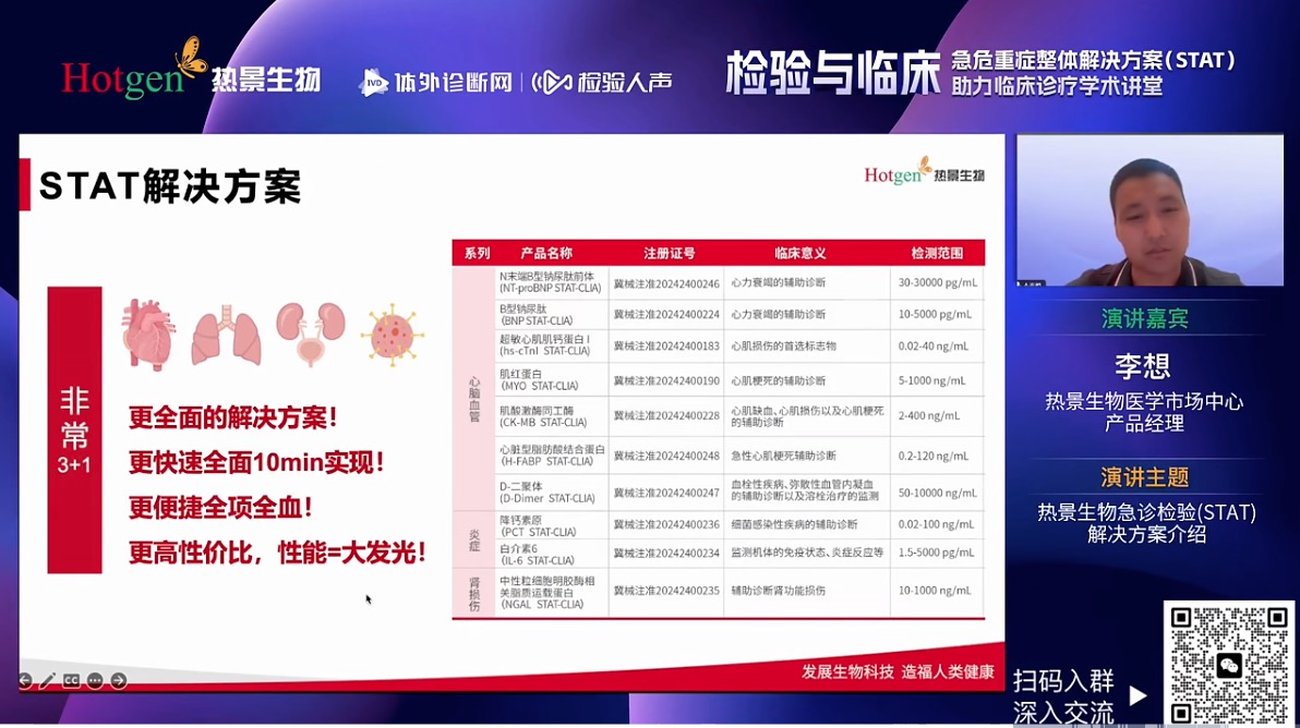 熱景生物醫(yī)學(xué)市場中心李想經(jīng)理根據(jù)臨床調(diào)研結(jié)果以及在急危重癥多樣化患者,分享熱景生物完整的急危重癥整體解決方案(STAT),并且分別闡述了不同場景匹配的解決方案,實現(xiàn)全血單人份10min準確報告出具,目前涵蓋心腦血管、炎癥以及腎損傷相關(guān)指標的全景解決方案,非常適用于胸痛中心、急診、ICU等臨床科室開展。