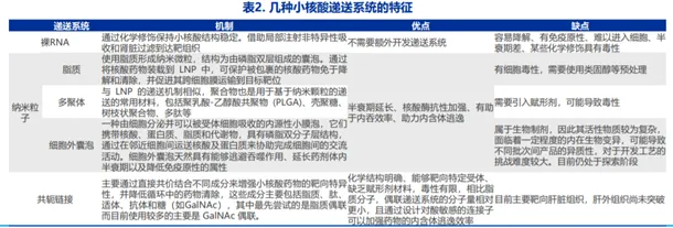 按照不同遞送技術(shù)分類,可以分為裸露RNA修飾遞送技術(shù)、脂質(zhì)體納米遞送技術(shù)、共軛連接遞送系統(tǒng)(小分子配體、抗體及其他分子)和其他多種類型的新型遞送系統(tǒng)(如多聚體納米粒遞送系統(tǒng)、細(xì)胞外囊泡遞送系統(tǒng))。其中,LNP和GaINac技術(shù)相對成熟。GaINac技術(shù)主要靶向肝臟,未來靶向其他器官的藥物遞送系統(tǒng)也有望突破,如Alnylam和 Arrowhead正在研發(fā)的針對中樞神經(jīng)系統(tǒng)、眼睛、腎癌細(xì)胞與肺上皮細(xì)胞等遞送系統(tǒng)。