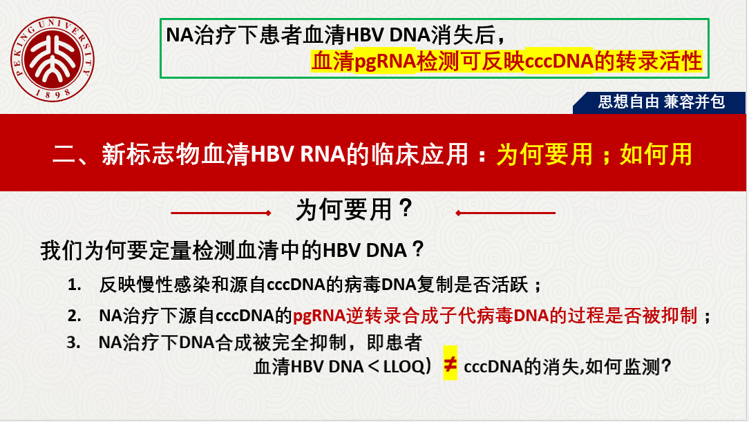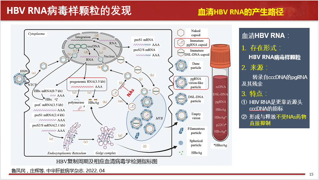 關(guān)于HBV RBA病毒樣顆粒的發(fā)現(xiàn)、血清HBV RNA的產(chǎn)生路徑、存在形式、來源和特點(diǎn)等做了詳細(xì)闡述,同時(shí)分享國內(nèi)肝病領(lǐng)域張文宏研究團(tuán)隊(duì)等工作成果,血清HBV RNA水平反映肝內(nèi)cccDNA的轉(zhuǎn)錄活性,血清 HBV pgRNA,是NA治療下HBV DNA < LLOQ后,能夠反映患者肝組織內(nèi)是否有cccDNA活躍轉(zhuǎn)錄的唯一指標(biāo)。