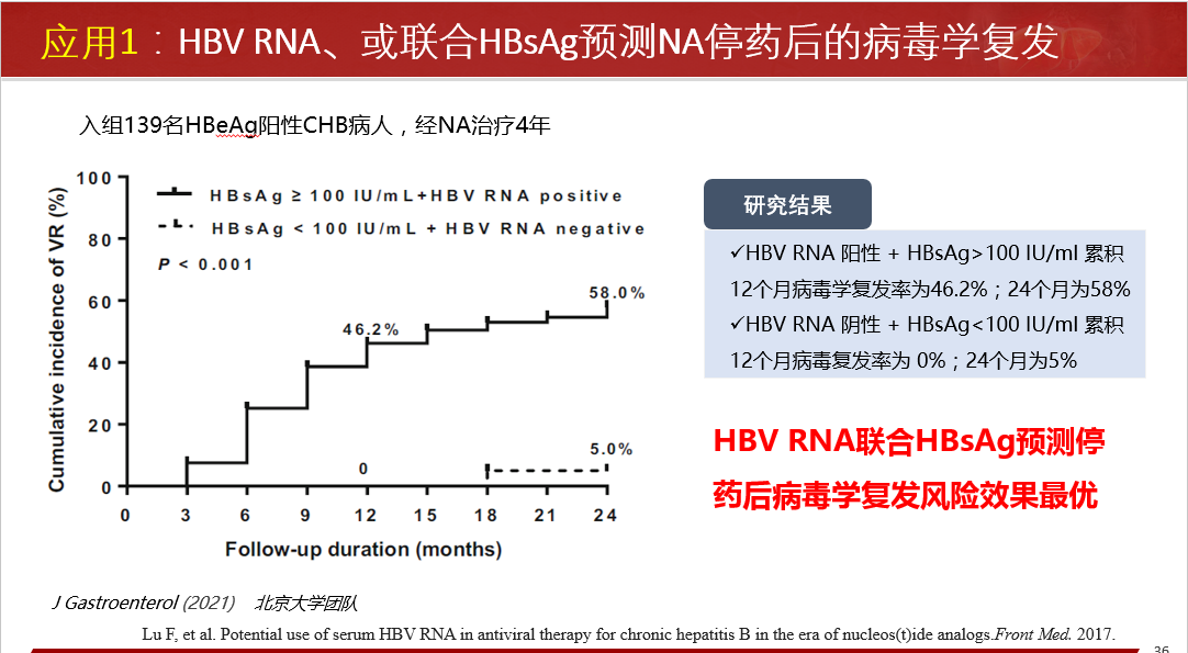 臨床應(yīng)用方面:指導(dǎo)安全停藥;NA治療下患者血清HBV RNA檢測陽性預(yù)示更高的HCC發(fā)生風(fēng)險(xiǎn);NA治療下患者血清HBV RNA檢測陽性,提示病毒cccDNA仍在有效轉(zhuǎn)錄表達(dá)病毒蛋白、組裝子代病毒顆粒樣pgRNA病毒顆粒。