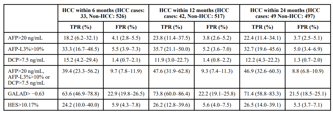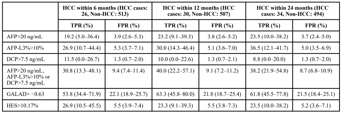 這項(xiàng)研究遵循了嚴(yán)格的PRoBE設(shè)計(jì)(Prospective-specimen collection, Retrospective-blinded-evaluation,前瞻性樣本收集、回顧性盲法評(píng)估,特別適用于癌癥早期檢測(cè)和篩查研究。),從534名病毒性肝炎及酒精肝患者中收集了血液樣本,并在6個(gè)月、12個(gè)月和24個(gè)月內(nèi)對(duì)是否發(fā)展為肝癌進(jìn)行了隨訪(fǎng)分析。
