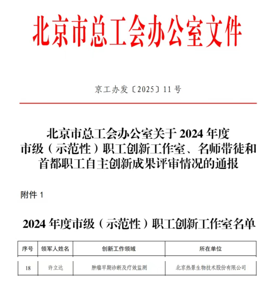 熱景生物「腫瘤早期診斷及療效監(jiān)測」工作室榮獲“北京市級職工創(chuàng)新工作室”稱號